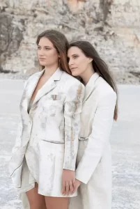 Efekti na svilenim tkaninama su mutni i neprecizni, gotovo impresionistički. Minimalističke krojeve krase zanimljivi detalji, poput otvorenih leđa, koji, u kombinaciji sa polutransparentnim materijalima, suptilno ističu žensku eleganciju i privlačnost. Ono što se u ovoj kolekciji posebno ističe su svileni sakoi i blejzeri s eko printom. Jedinstveni, uglavnom muških krojeva, pastelnih tonova i srebrnkastog odsjaja, savršeno se uklapaju u modne trendove za proljeće 2023.