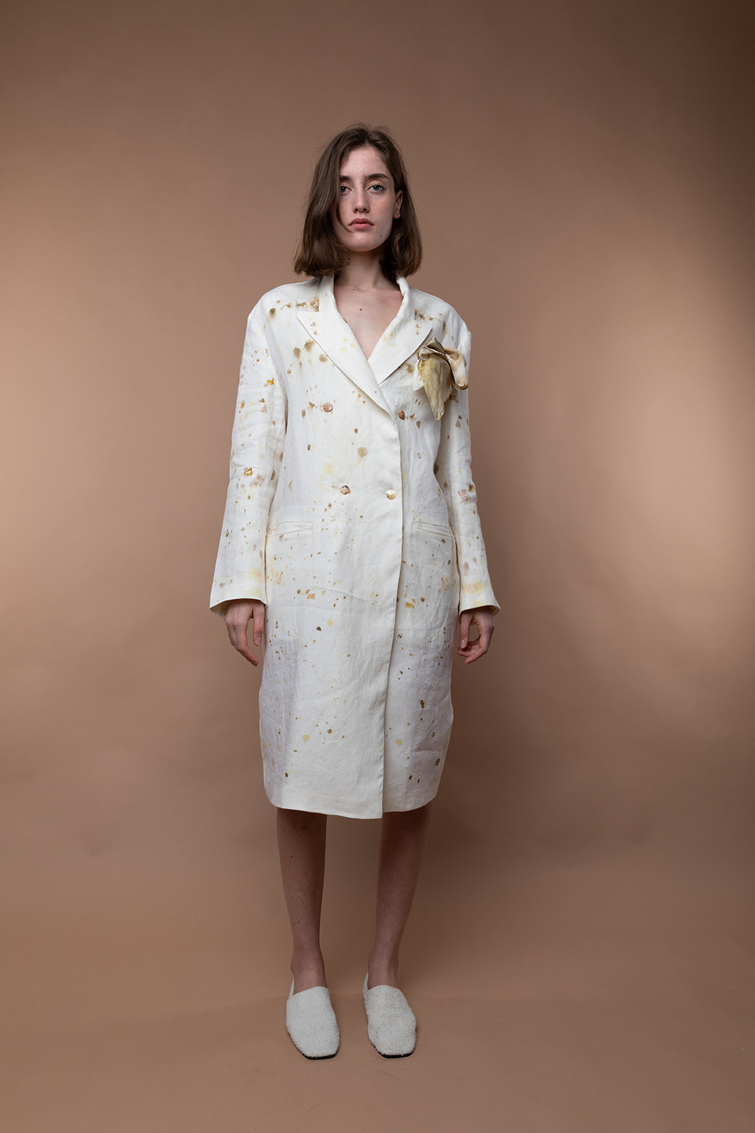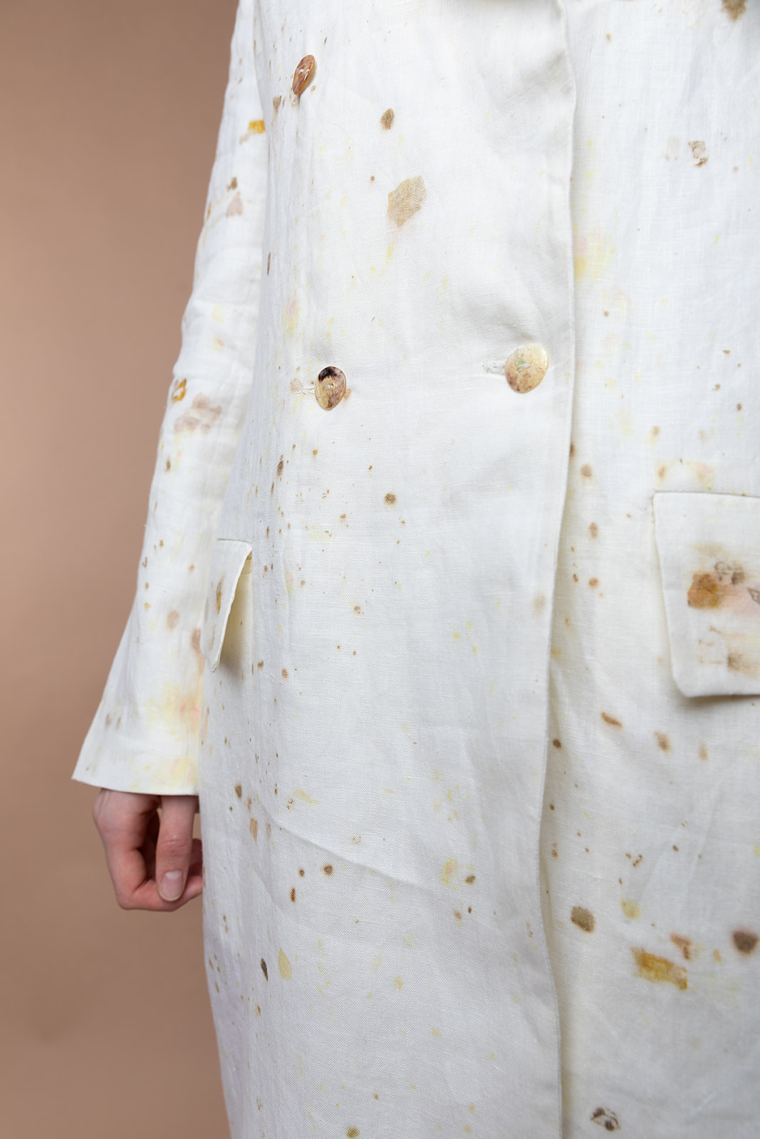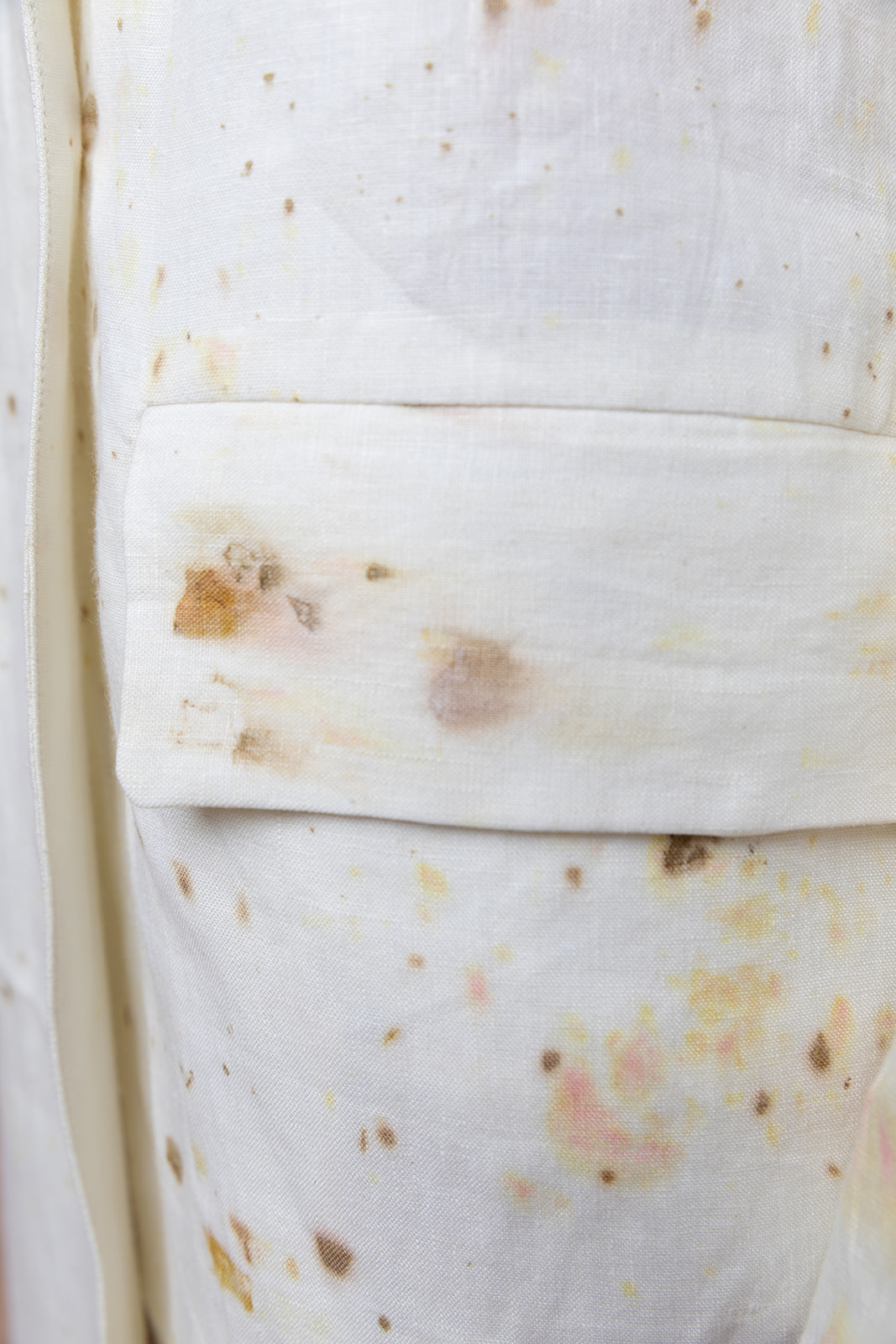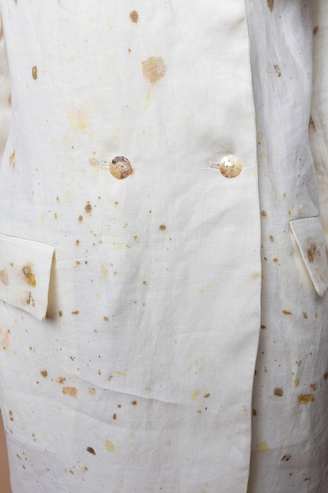 Opis: Oversize blazer bojan invazivnim biljkama svoga kraja. Duplo kopčanje, sprijeda 3 džepa.