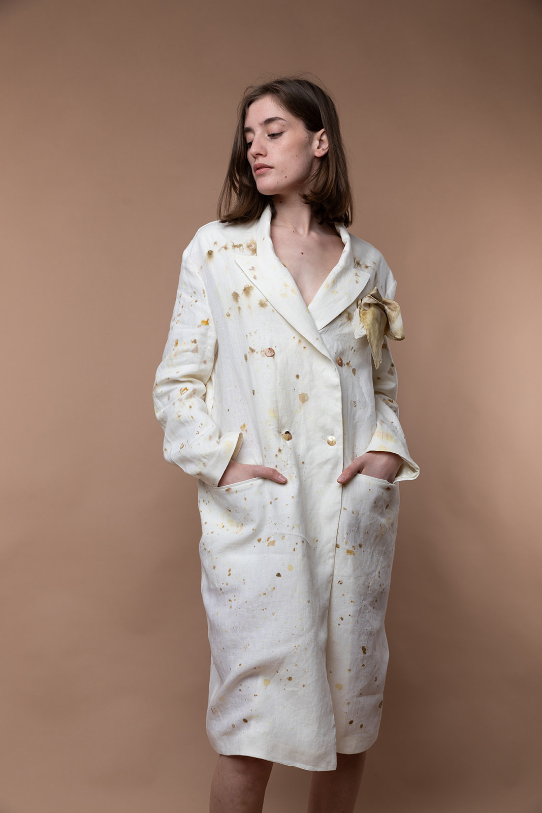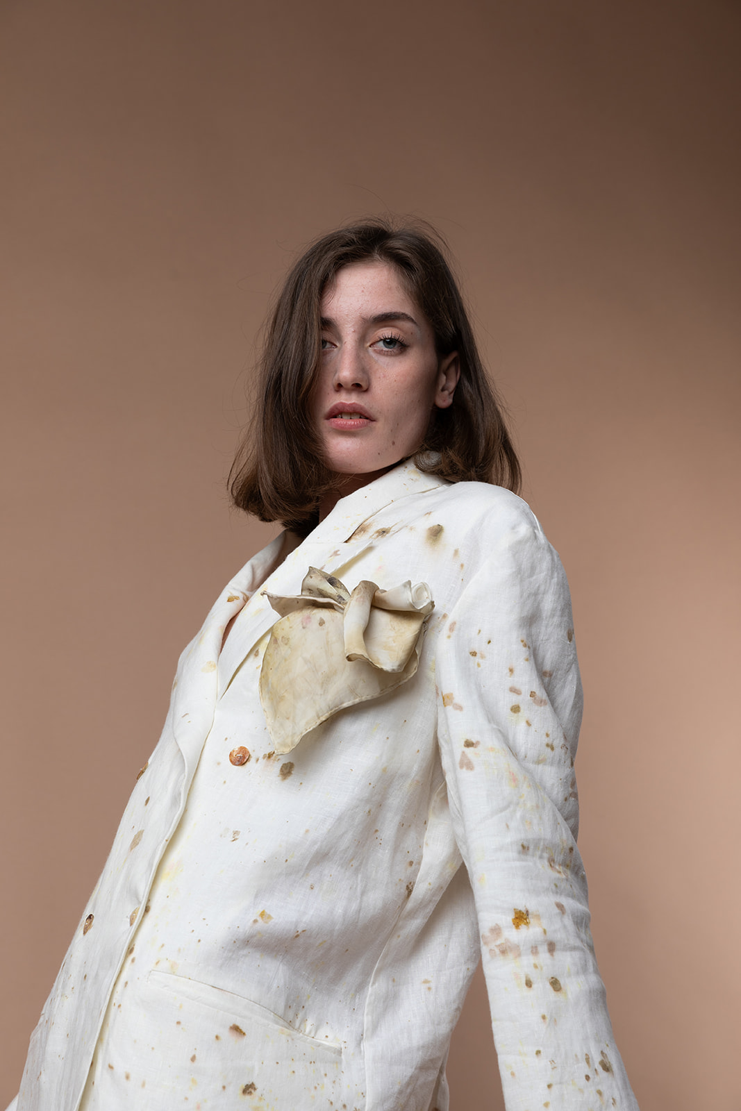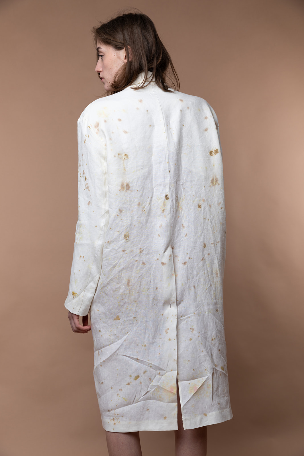 Opis: Oversize blazer bojan invazivnim biljkama svoga kraja. Duplo kopčanje, sprijeda 3 džepa.