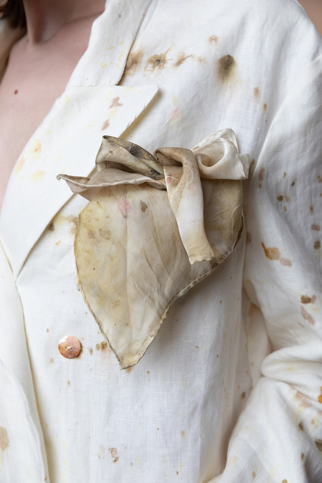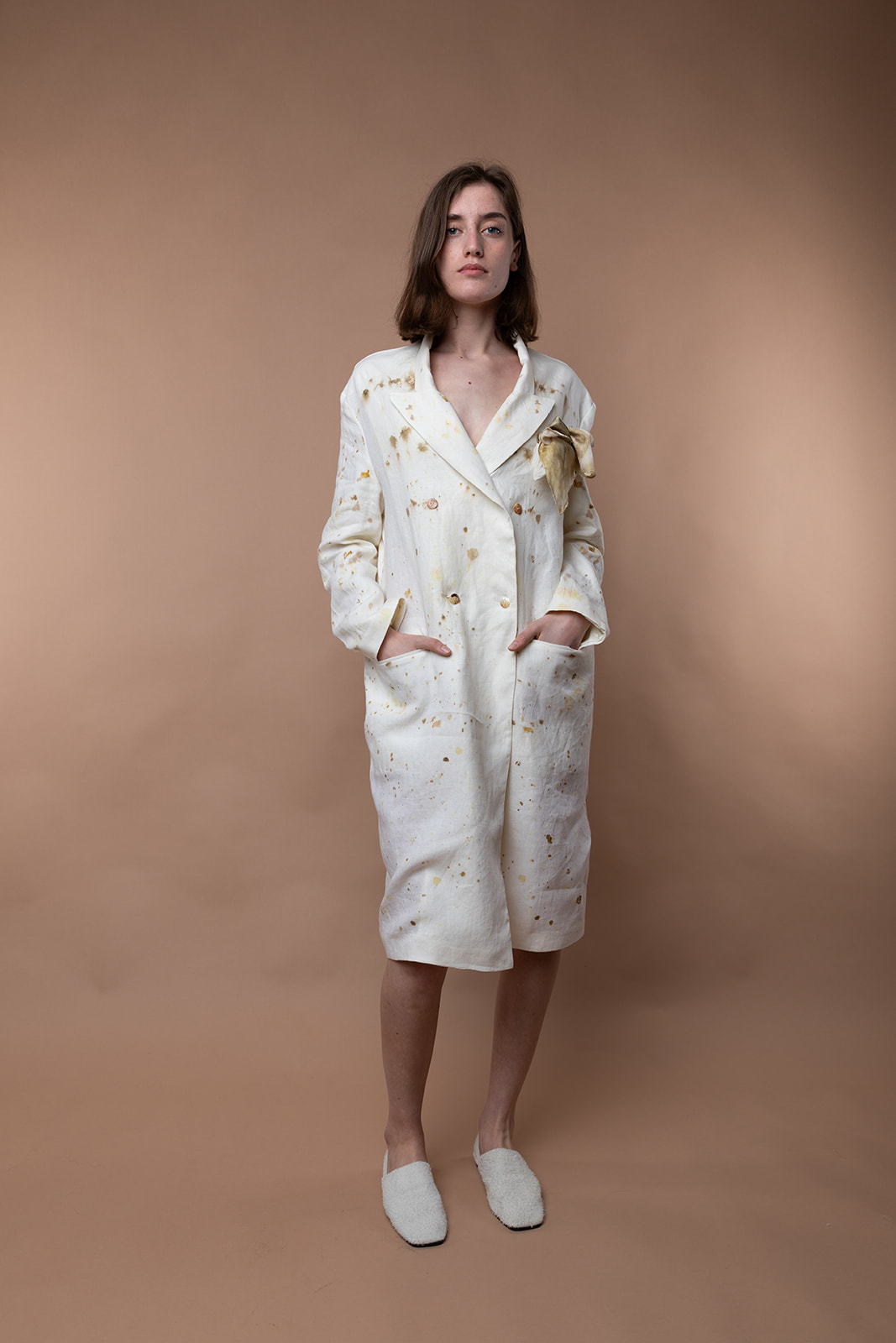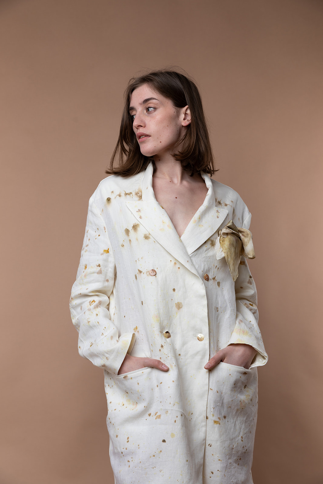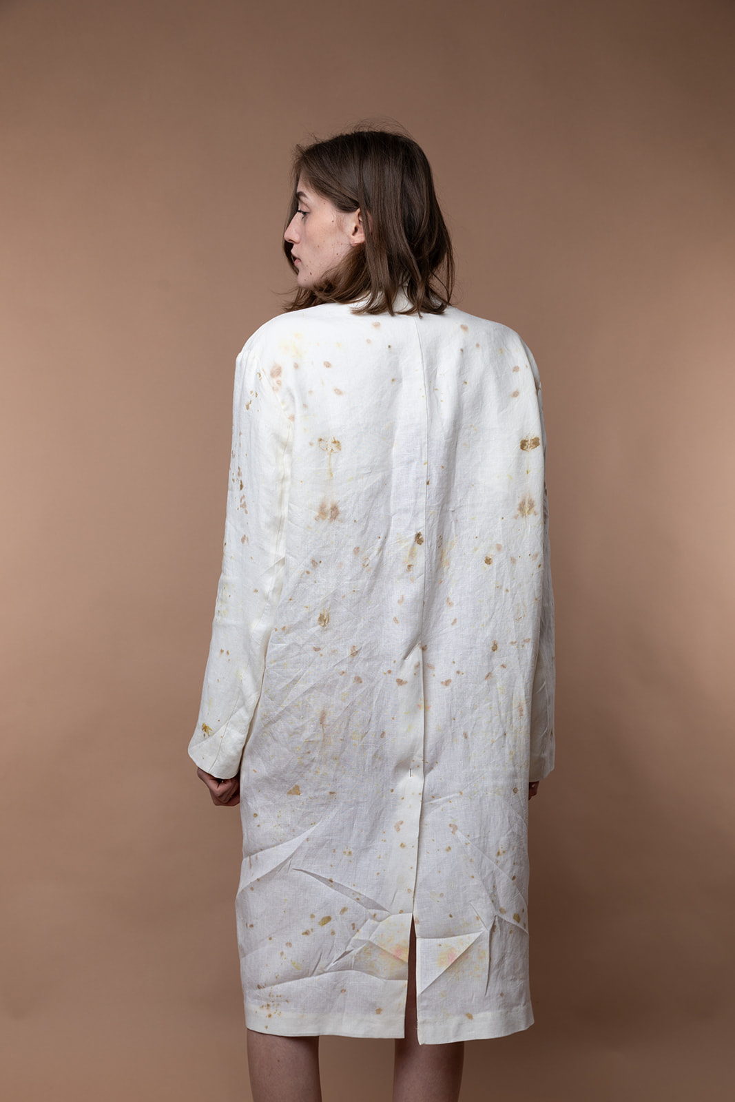 Opis: Oversize blazer bojan invazivnim biljkama svoga kraja. Duplo kopčanje, sprijeda 3 džepa.